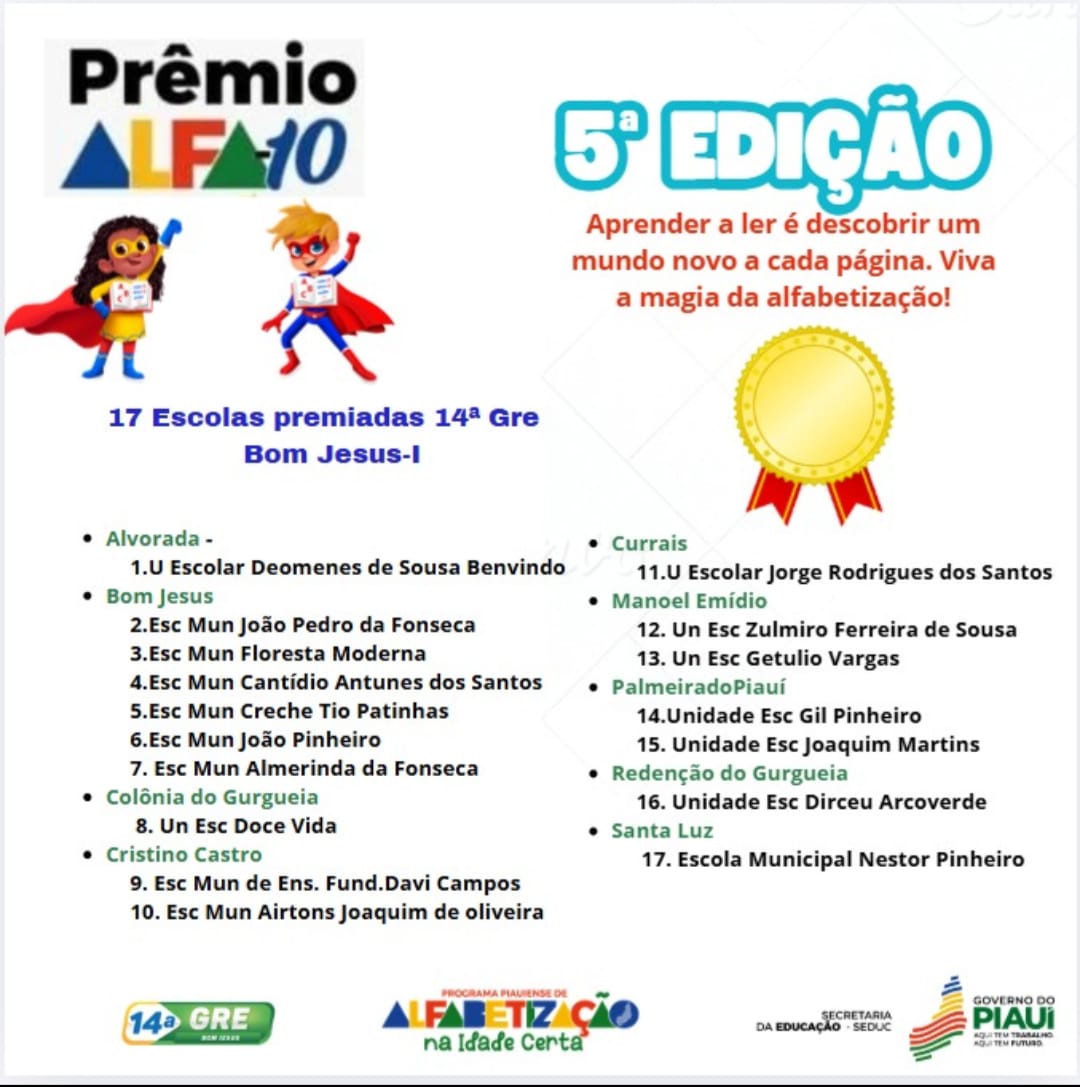 A confirmação veio com o Prêmio Alfa-10 da SEDUC-PI, divulgado hoje, 22 de abril de 2026. Na 14ª GRE (Gerência Regional de Educação de Bom Jesus), da qual Eliseu Martins faz parte, 17 escolas foram premiadas em nove municípios – Bom Jesus (6 escolas), Cristino Castro (2), Manoel Emídio (2), Palmeira do Piauí (2), Alvorada do Gurgueia (1), Colônia do Gurgueia (1), Currais (1), Redenção do Gurgueia (1) e Santa Luz (1). Eliseu Martins foi o único município da regional com zero escolas premiadas.