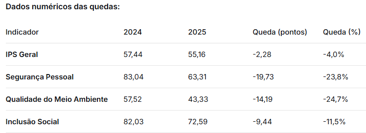 Esta regressão é um reflexo direto da deterioração em setores fundamentais para a qualidade de vida da população. O indicador que mais sofreu foi a Segurança Pessoal, que despencou quase 20 pontos, de 83,04 para 63,31, refletindo um cenário de aumento da violência. A Qualidade do Meio Ambiente também sofreu um colapso, com uma queda de mais de 14 pontos, indicando um possível agravamento na gestão ambiental, como aumento de emissões de poluentes ou supressão da vegetação nativa. As Necessidades Humanas Básicas, que englobam itens essenciais como nutrição, água, saneamento e moradia, regrediram mais de 6 pontos, com destaque negativo para a piora nos cuidados médicos básicos. A Inclusão Social, que mede a paridade de gênero e raça na representação política e o acesso a direitos, também retrocedeu quase 10 pontos, sinalizando um passo atrás na promoção da equidade.
