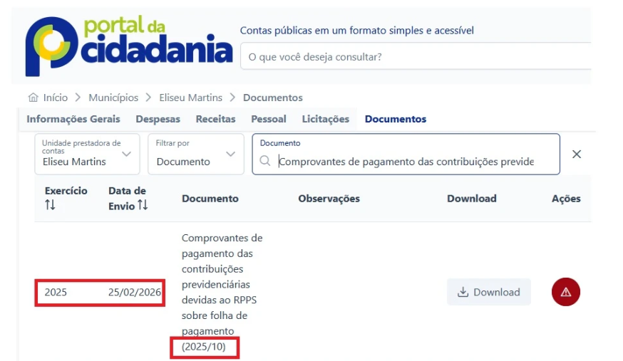 Um dia depois de o Tribunal de Contas do Estado determinar o bloqueio das contas da Prefeitura de Eliseu Martins, a gestão do prefeito Marcos Aurélio correu para enviar ao TCE pelo menos parte dos documentos que estavam em falta. Na noite de ontem, novos arquivos apareceram no Portal da Cidadania: os comprovantes de pagamento das contribuições previdenciárias devidas ao RPPS referentes ao mês 10/2025.