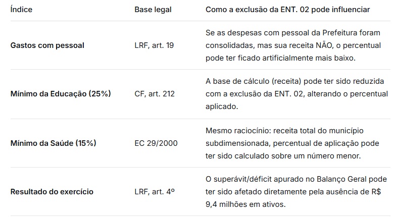 Se foi proposital, aí a coisa é mais grave ainda. A não inclusão da Prefeitura na consolidação de dezembro pode ter impactado diretamente os índices finais do exercício. Dependendo de como os números foram "maquiados", o município poderia: