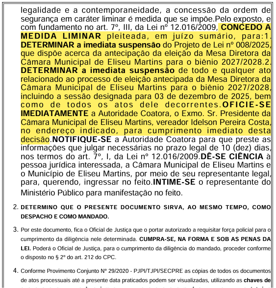 Em decisão proferida na última segunda-feira (15/12), o Juiz Eleitoral da 67ª Zona de Manoel Emídio, Thiago Carvalho Martins, julgou improcedente a Ação de Impugnação de Mandato Eletivo (AIME) movida pelo Diretório Municipal do MDB de Eliseu Martins contra candidatos do PSD por suposta fraude à cota de gênero nas eleições de 2024.