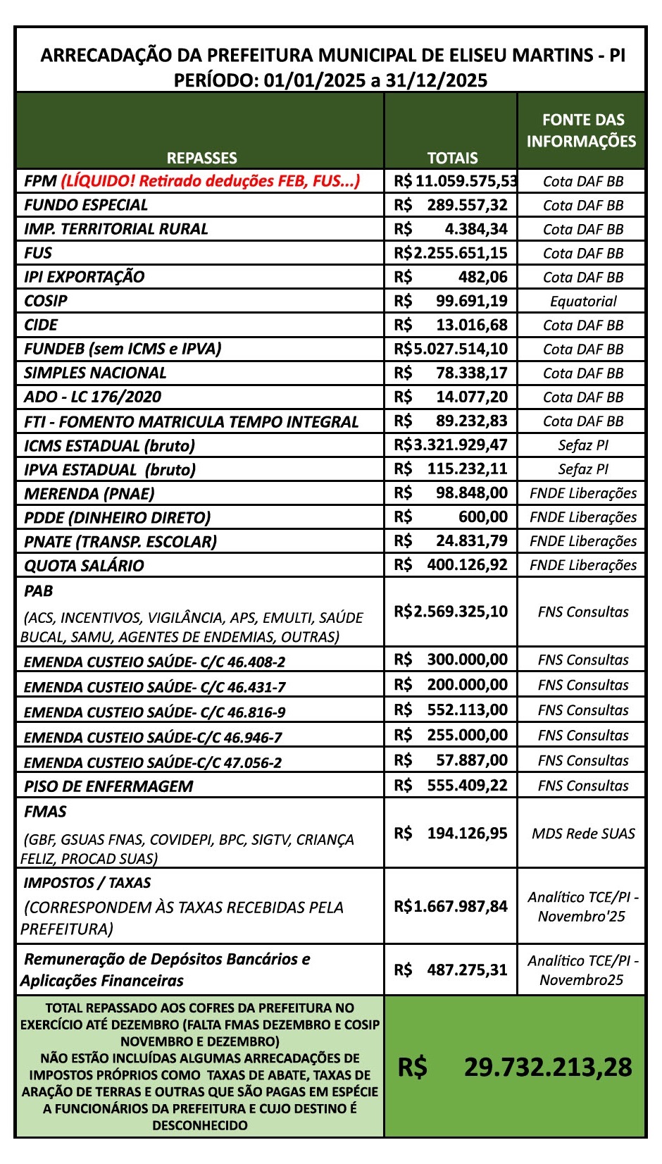 A Prefeitura Municipal de Eliseu Martins-PI, encerrou o ano de 2025 com uma arrecadação total que gira em torno de R$ 30 milhões, considerando todos os repasses federais, estaduais e receitas próprias. O valor é aproximado, pois parte das taxas municipais — como as de aração de terras e vigilância sanitária — são pagas em espécie a funcionários e...