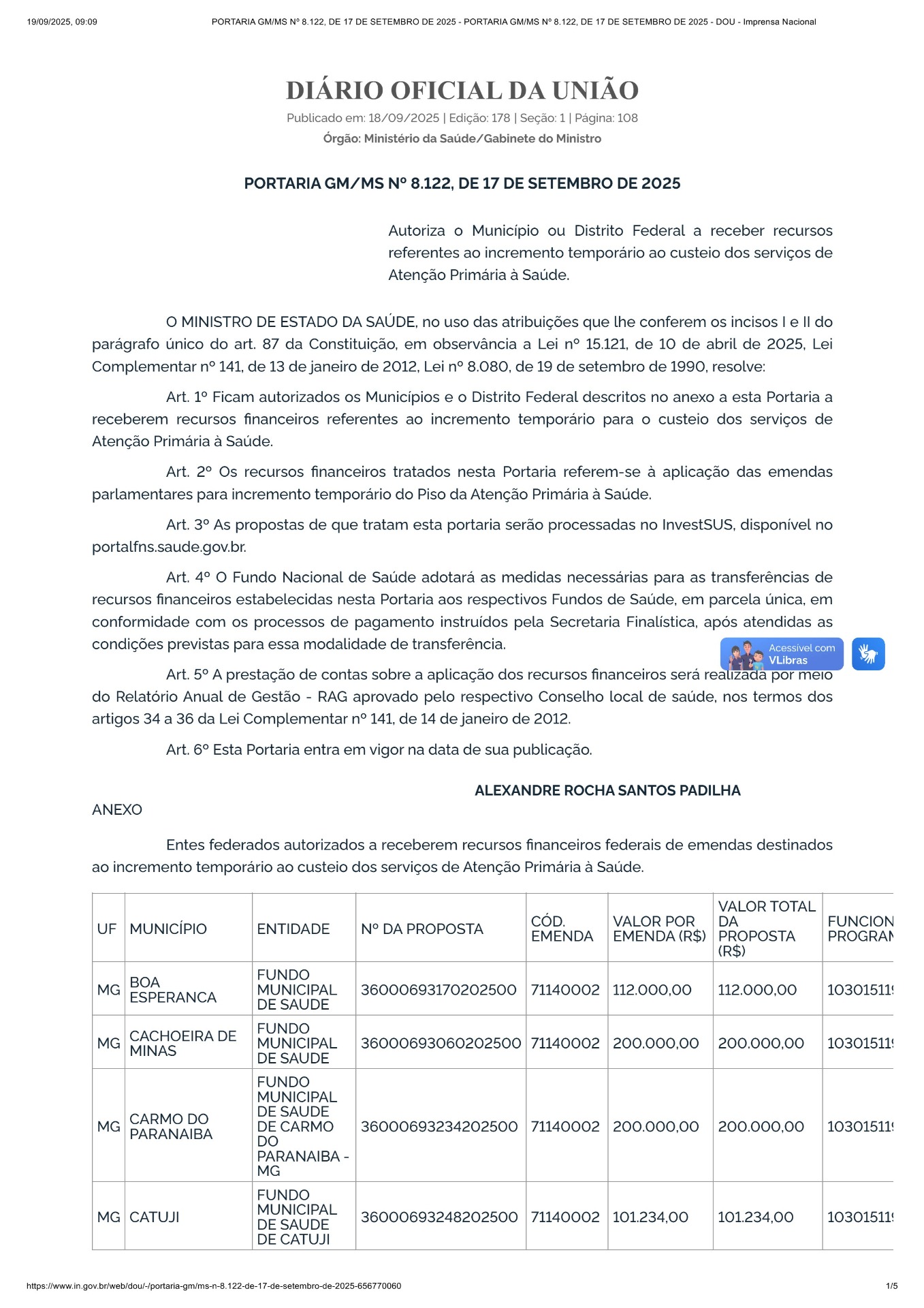 A Portaria GM/MS nº 8.122, de 17 de setembro de 2025, publicada pelo Ministério da Saúde, autorizou o repasse de recursos financeiros para diversos municípios do Piauí, destinados ao reforço temporário do custeio da Atenção Primária à Saúde.